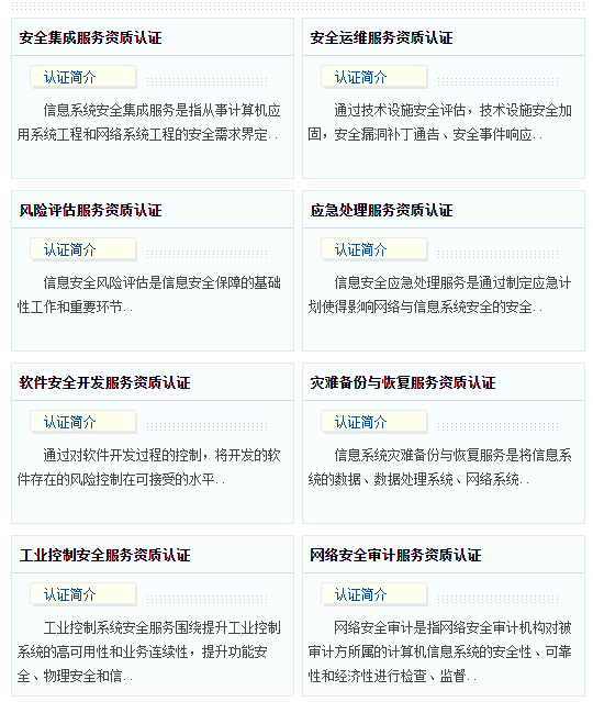1、為企業(yè)申報安全集成服務(wù)資質(zhì)認證、風(fēng)險評估服務(wù)資質(zhì)認證、應(yīng)急處理服務(wù)資質(zhì)認證、災(zāi)難備份與恢復(fù)服務(wù)資質(zhì)認證、軟件安全開發(fā)服務(wù)資質(zhì)認證、安全運維服務(wù)資質(zhì)認證一級,二級,三級,四級。當(dāng)認證證書有效期滿時,申請再認證;