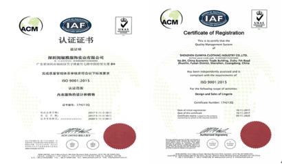 由國內(nèi)權(quán)威認證機構(gòu)的嚴格審核,“閨蜜呀”獲得了新版ISO9001:2015質(zhì)量管理體系認證,深圳閨秘雅服飾實業(yè)有限公司在產(chǎn)品的生產(chǎn)過程中嚴格把控產(chǎn)品質(zhì)量,向顧客提供滿意高品質(zhì)產(chǎn)品。閨秘雅公司通過該認證,說明閨秘的生產(chǎn)的內(nèi)衣產(chǎn)品質(zhì)量達到消費者的消費要求,并且受到人們的喜愛,也說明閨秘雅公司的日常管理以及生產(chǎn)工序,操作流程已達到國際生產(chǎn)標(biāo)準(zhǔn)。