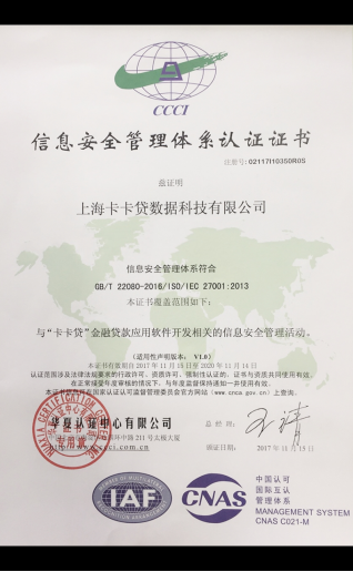 卡卡貸就是短時(shí)間內(nèi)解決消費(fèi)者資金周轉(zhuǎn)不便的情況下,一種網(wǎng)上辦理信用卡的金融服務(wù)。由于中國人的思想觀念比較復(fù)雜,我們常說:有便宜不占王八蛋,這種思想觀念害人害己。為了避免出現(xiàn)這種情況,卡卡貸推出了新舉措。卡卡貸提高了網(wǎng)絡(luò)平臺的安全性,獲得 ISO27001信息安全管理體系標(biāo)準(zhǔn)認(rèn)證證書,維護(hù)公司消費(fèi)者的共同利益。
