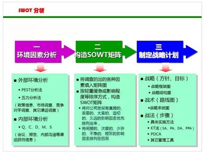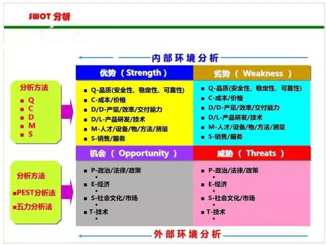 SWOT分析,首先來解釋一下其含義,S-優(yōu)勢,W-劣勢,O-機(jī)遇,T-威脅,其中S、W是企業(yè)的內(nèi)部因素,O、T是企業(yè)的外部因素,企業(yè)內(nèi)部資源加上企業(yè)外部環(huán)境就是企業(yè)戰(zhàn)略。
